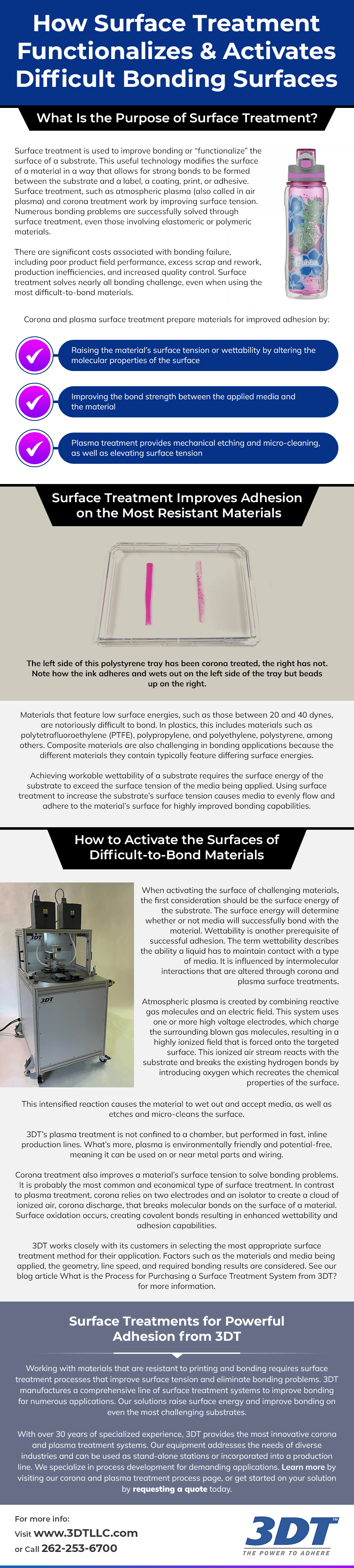 Surface treatment is used to improve bonding or “functionalize” the surface of a substrate. This useful technology modifies the surface of a material in a way that allows for strong bonds to be formed between the substrate and a label, a coating, print, or adhesive. Surface treatment, such as atmospheric plasma (also called in air plasma) and corona treatment work by improving surface tension. Numerous bonding problems are successfully solved through surface treatment, even those involving elastomeric or polymeric materials.