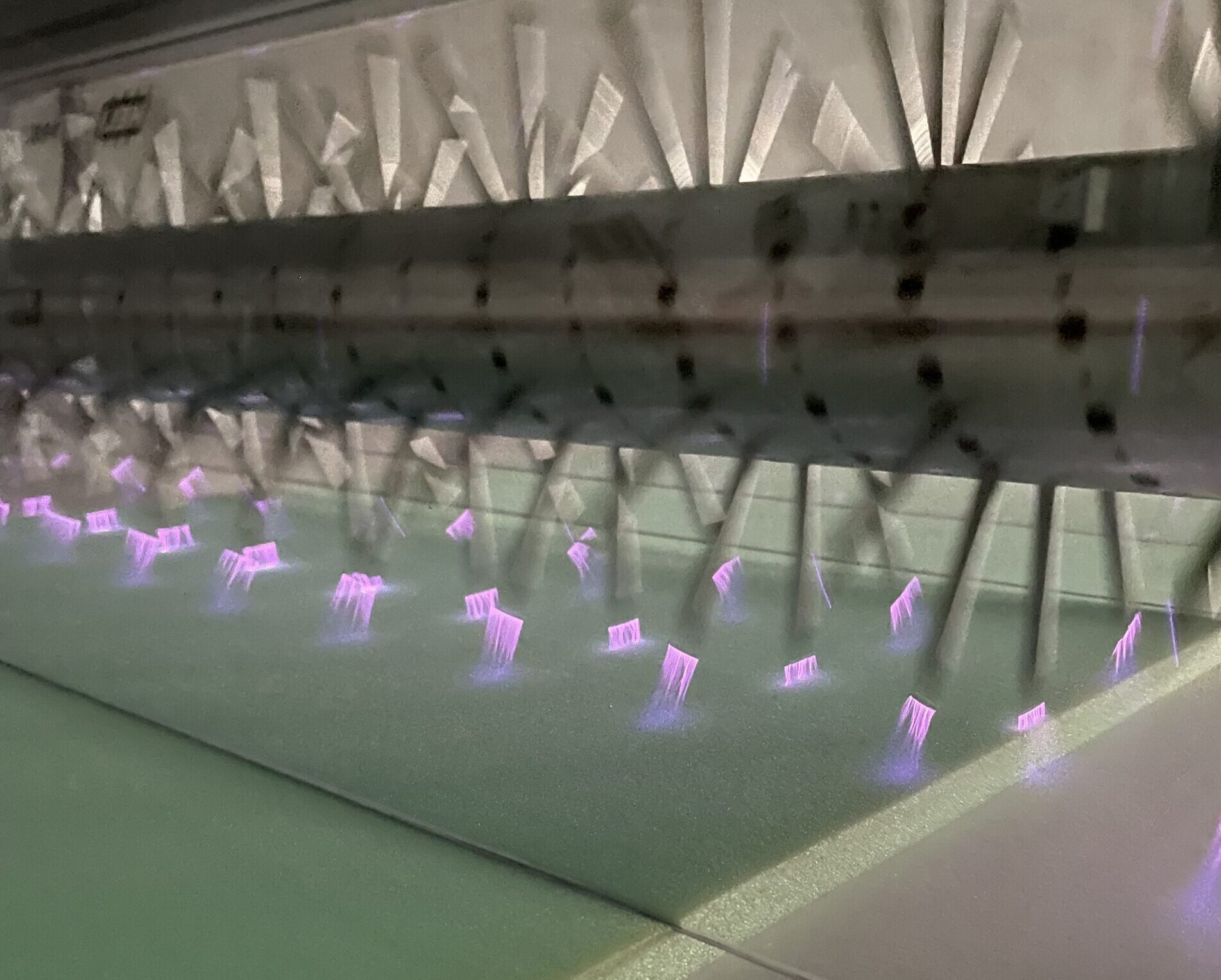 To treat the material, it’s placed under a cloud of corona discharge, which is created by exposing atmospheric air to different voltage potentials. The electrons hold energy up to three times higher than what’s needed to break molecular bonds on the surface, and the free radicals quickly go to work oxidizing the material in the cloud. The result is increased surface tension, which allows for wetting and adhesion.