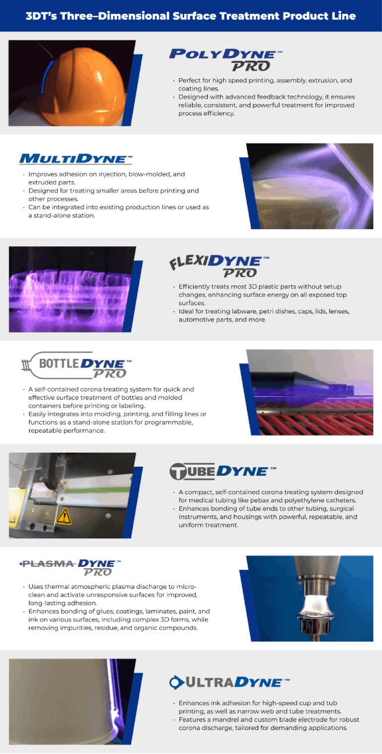 MultiDyne – 3DT’s MultiDyne corona treatment system greatly improves adhesion on injection, blow molded, and extruded parts. It is designed for the treatment of smaller areas prior to printing and other processes. It can be incorporated into existing production lines or used as a stand-alone work station. MultiDyne is built with state-of-the art components and thoroughly customizable for your application.